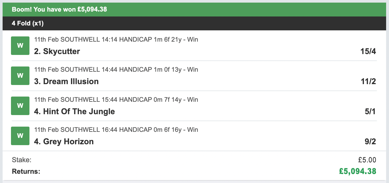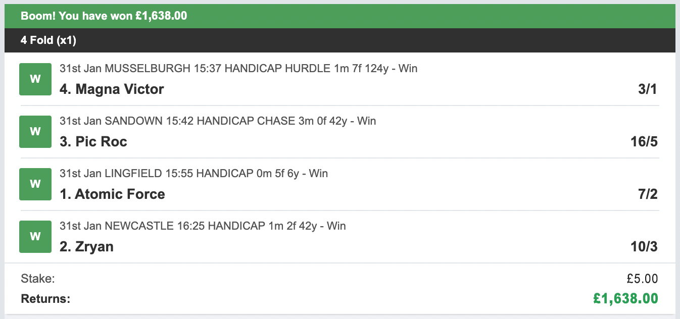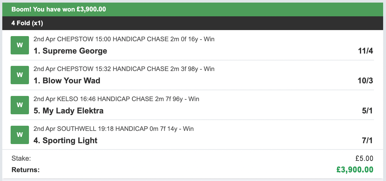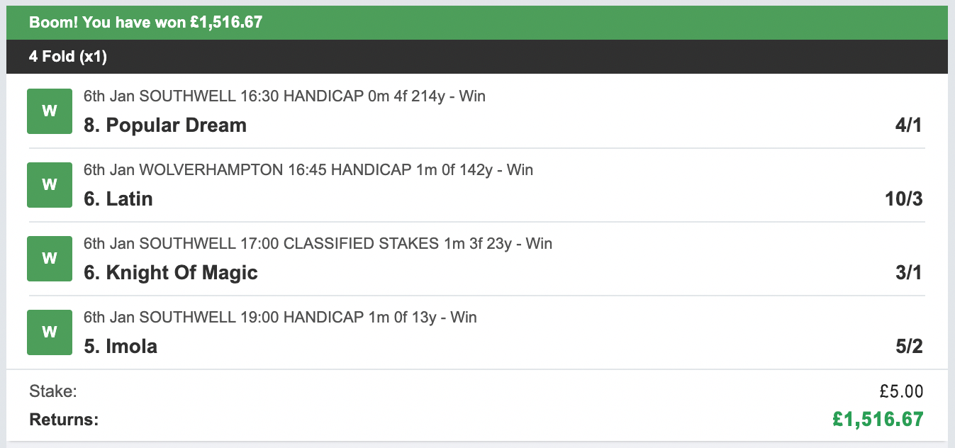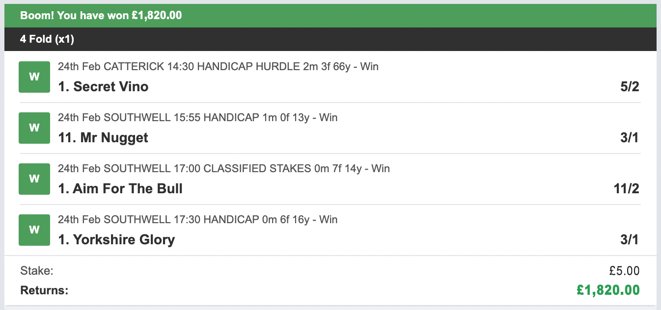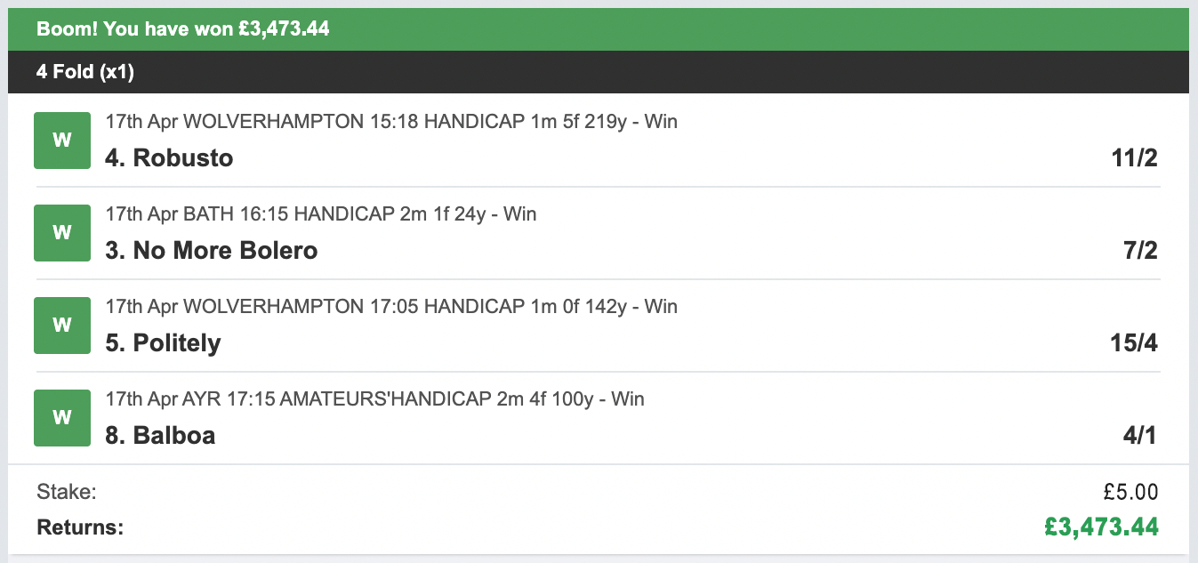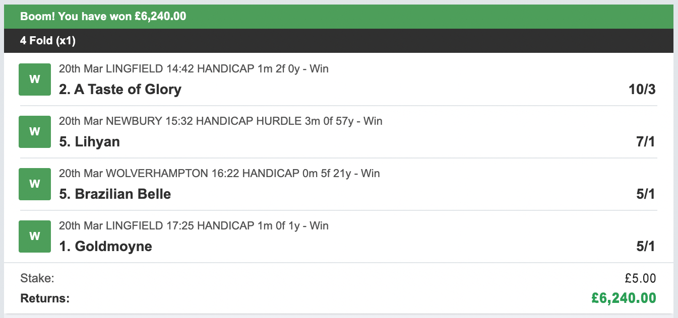 I back them all as a fourfold bet using a SINGLE SUPER LOW £5 DAILY STAKE!